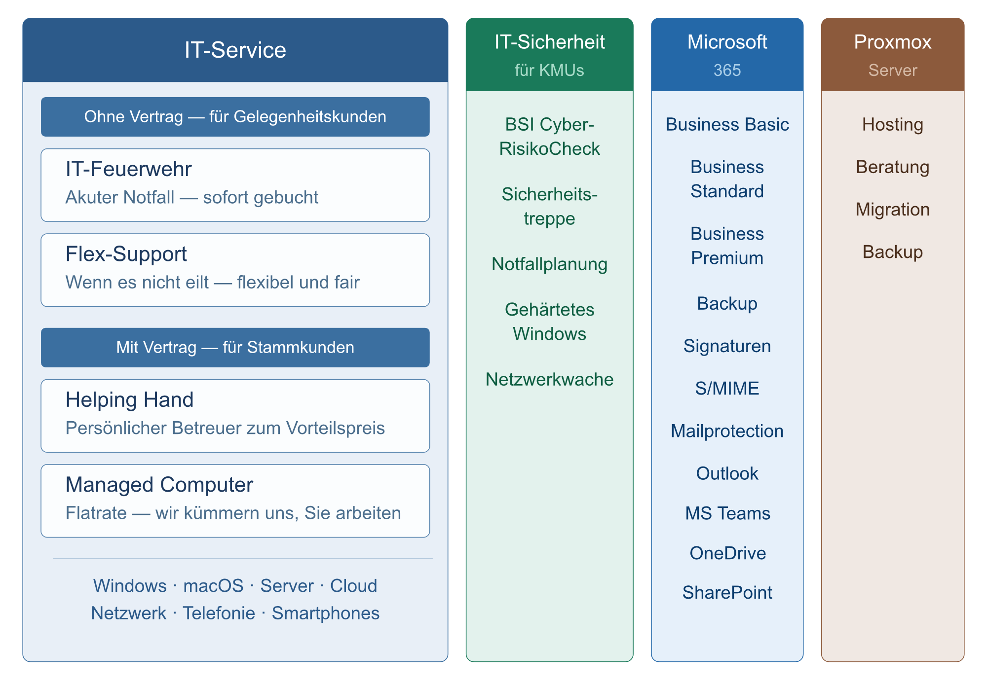 Besondere Expertise haben wir bezüglich der Angebote der Microsoft 365-Cloud und in Fragen der IT-Sicherheit. Seit 2022 arbeiten wir mit den europäischen Virtualisierungslösungen von Proxmox.